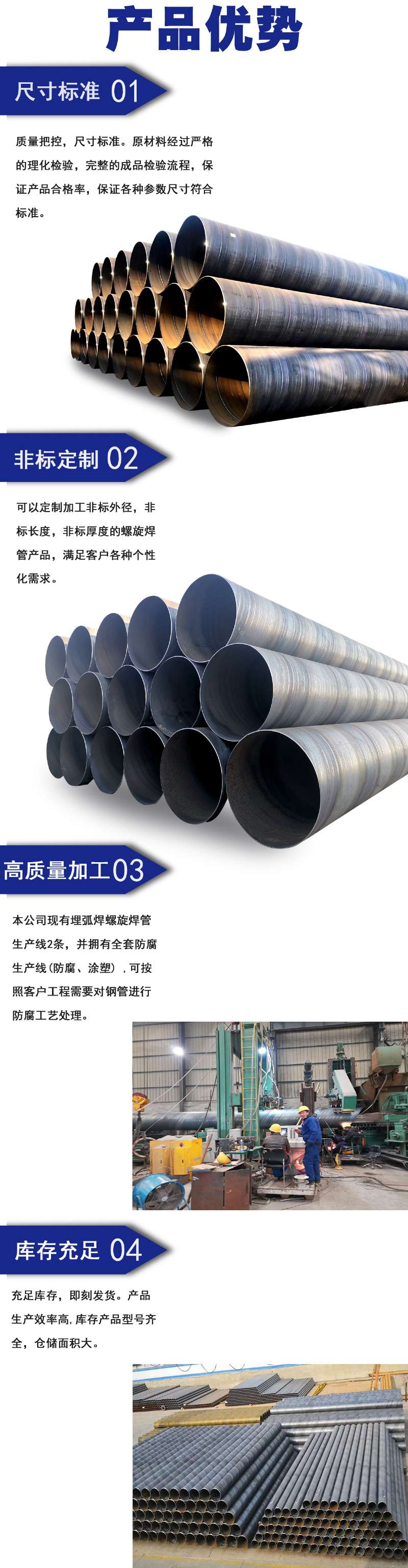 滄州友誠(chéng)管業(yè)法蘭焊接鋼管專業(yè)生產(chǎn)廠家,法蘭焊接國(guó)標(biāo)螺旋鋼管埋弧焊是以連續(xù)送時(shí)的焊絲作為電極和填充金屬。焊接時(shí),在焊接區(qū)的上面覆蓋一層顆粒狀焊劑,電弧在焊劑層下燃燒,將焊絲端部和局部母材熔化,形成焊縫。在電弧熱的作用下,上部分焊劑熔化熔渣并與液態(tài)金屬發(fā)生冶金反應(yīng)。熔渣浮在金屬熔池的表面,一方面可以保護(hù)焊縫金屬,防止空氣的污染,并與熔化金屬產(chǎn)生物理化學(xué)反應(yīng),改善焊縫金屬的萬分及性能;另一方面還可以使焊縫金屬緩慢泠卻。埋弧焊可以采用較大的焊接電流。與手弧焊相比,其*da的優(yōu)點(diǎn)是焊縫質(zhì)量好,焊接速度高。因此,它特別適于焊接大型工件的直縫的環(huán)縫。而且多數(shù)采用機(jī)械化焊接。埋弧焊已廣泛用于碳鋼、低合金結(jié)構(gòu)鋼和不銹鋼的焊接。由于熔渣可降低接頭冷卻速度,故某些高強(qiáng)度結(jié)構(gòu)鋼、高碳鋼等也可采用埋弧焊焊接。埋弧焊鋼管:是以帶鋼卷板為原材料,經(jīng)常溫?cái)D壓成型,以自動(dòng)雙絲雙面埋弧焊工藝焊接而成的螺旋縫鋼管。埋弧焊螺旋鋼管是以連續(xù)焊絲作為電極和填充金屬,工作時(shí)在焊接區(qū)的上面覆蓋一層顆粒狀焊劑,電弧在焊劑層下燃燒,將焊絲端部和局部母材熔化,形成焊縫在電弧熱的作用下,上部分焊劑熔化熔渣并與液態(tài)金屬發(fā)生冶金反應(yīng)。熔渣浮在金屬熔池的表面,一方面可以保 護(hù)焊縫金屬,防止空氣的污染,并與熔化金屬產(chǎn)生物理化學(xué)反應(yīng),改善焊縫金屬的萬分及性能;另一方面還可以 使焊縫金屬緩慢泠卻。