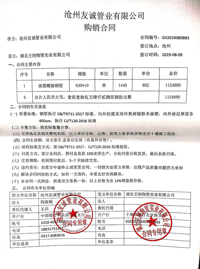 2019年8月9日我公司與湖北王剛物貿(mào)實業(yè)有限公司簽署購銷合同,市政管廊工程用DN600涂塑復(fù)合鋼管1440米,我公司專業(yè)于涂塑復(fù)合鋼管領(lǐng)域,目前國內(nèi)多地區(qū)的管廊工程建設(shè),給排水管道多用于涂塑復(fù)合鋼管,今后我們多重視于產(chǎn)品質(zhì)量,提高服務(wù)